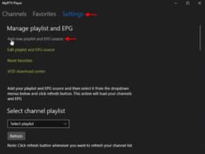Step 2: Click “Settings” and then “Add new playlist and EPG source.” Now move on to the next step.